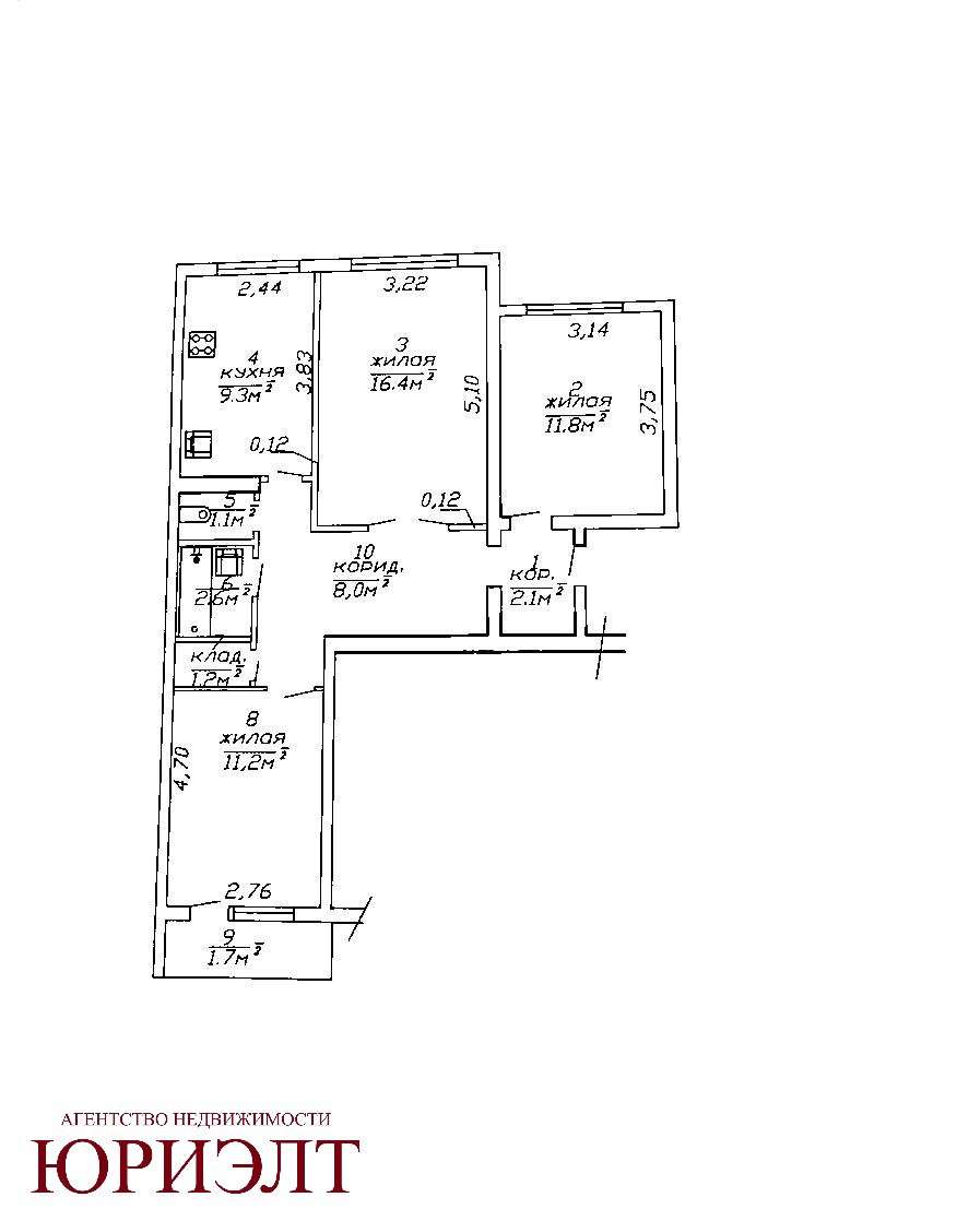 Общая площадь 65.4 м.кв., жилая 39.4 м.кв., кухня 9.3 м.кв.