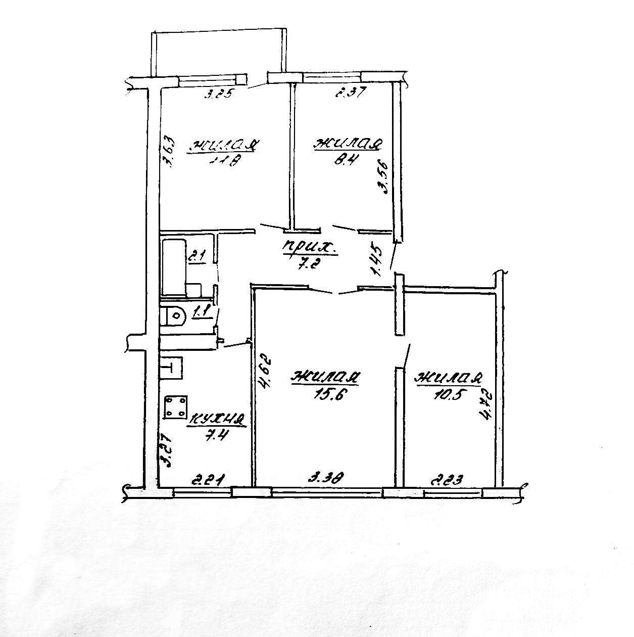 Общая площадь 64.1 м. кв. (без учета балкона), жилая 46.3 м. кв., кухня 7.4 м. кв.